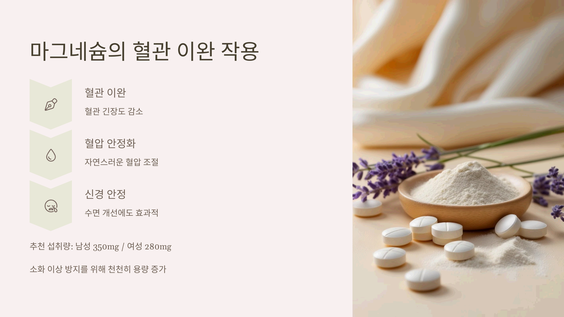 마그네슘은 혈관 이완과 신경 안정에 꼭 필요한 미네랄이에요.