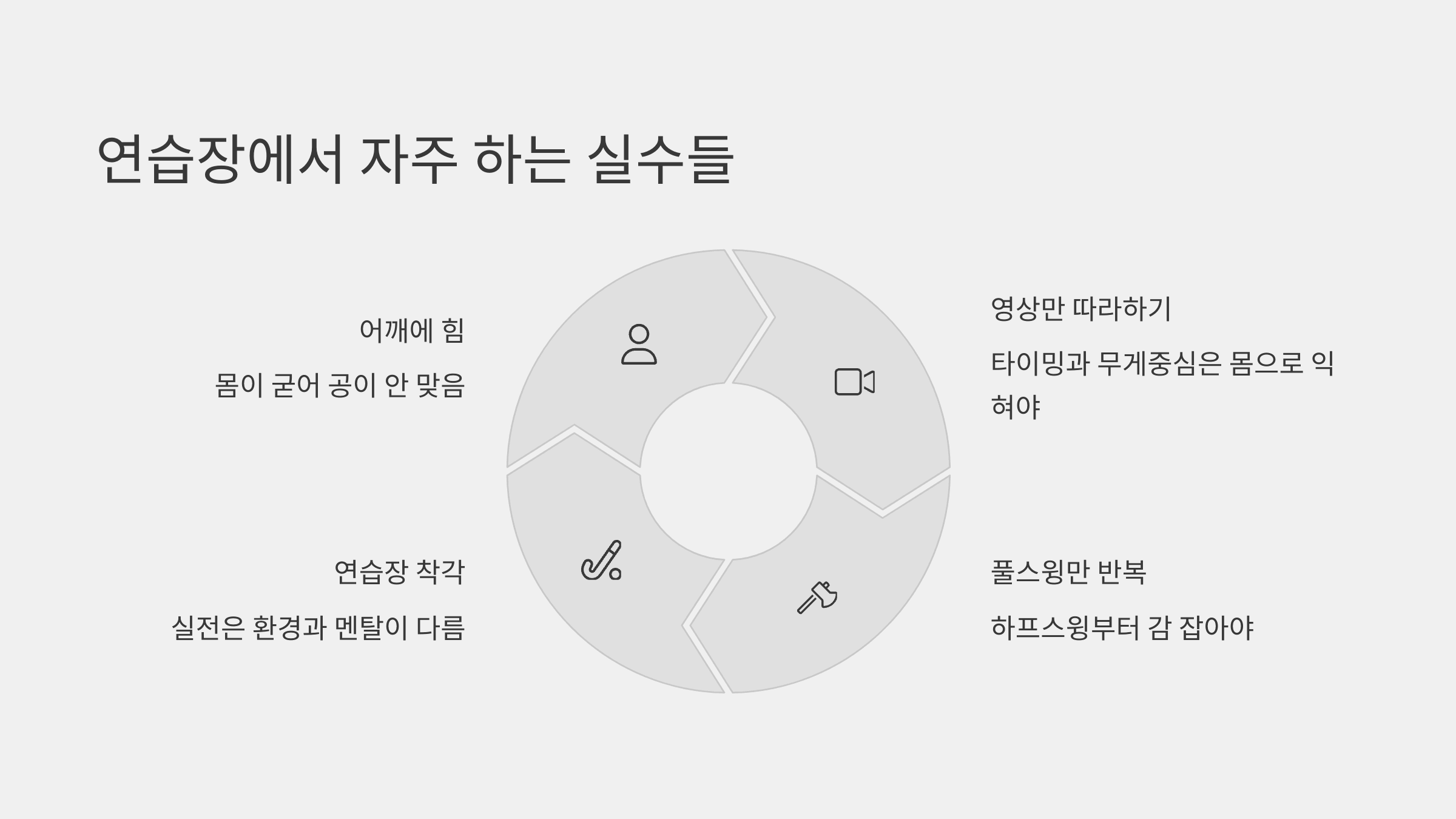 그리고 “풀스윙만 반복” 이게 진짜 흔한 함정이에요. 하프스윙부터 감을 잡고 나중에 풀스윙 연결해야 하는데 초반엔 무조건 크게만 휘둘러요.